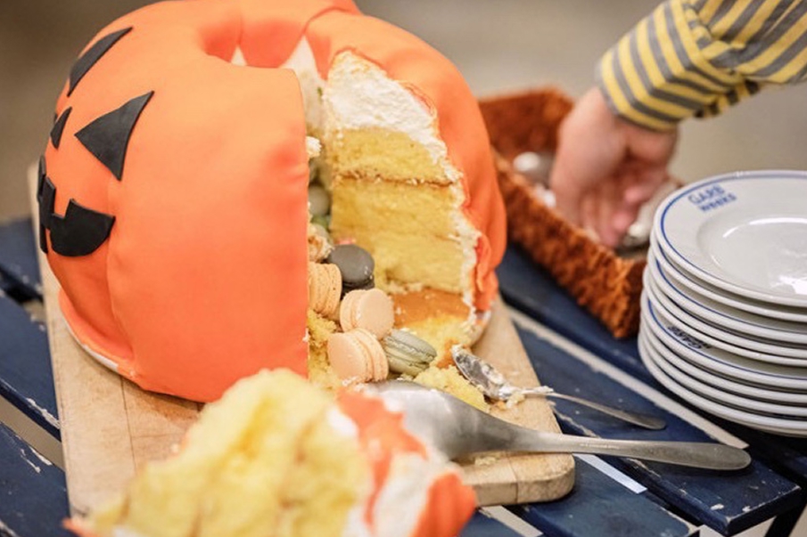 登場したのは、ハロウィンにちなんだおばけかぼちゃのケーキ!いざナイフを入れると、中からは色とりどりの手作りお菓子がゴロゴロ…。